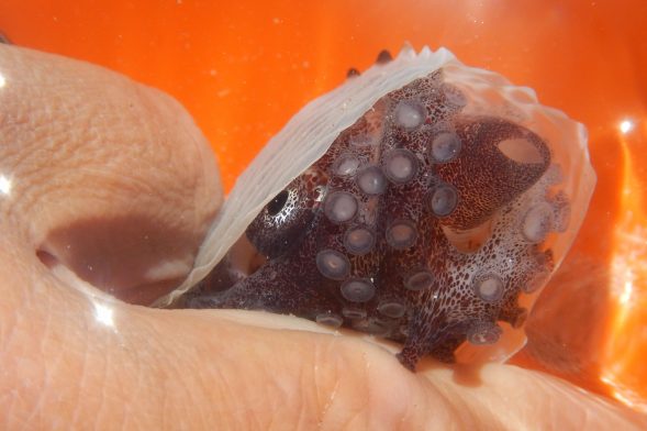 As whimsical as a paper nautilus may sound, Argonauta cornuta definitely exists. They brought it to me in a bowl of water, and it suctioned itself to my finger. This was the first live paper nautilus that most of the other guides had ever seen in our combined 85 years of combing these beaches and snorkeling these waters. In my 20 years here, I’ve seen a few dozen empty shells, but only 2 live specimens.