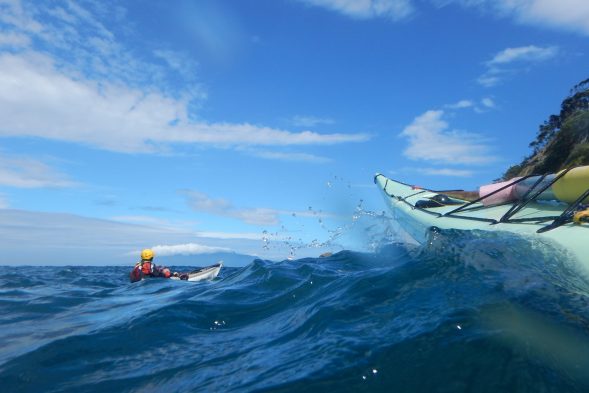 We started paddling up the west side, to build the team and see what we were capable of. We found some headwind, and raced a dropping tide to The Green campsite. On day 2, we landed early, played hockey with the cow patties to clear a beautiful campsite, and named it Cow Patty Heaven. Then we played the afternoon away along the edges of the Broken Islands as the wind and swell grew.