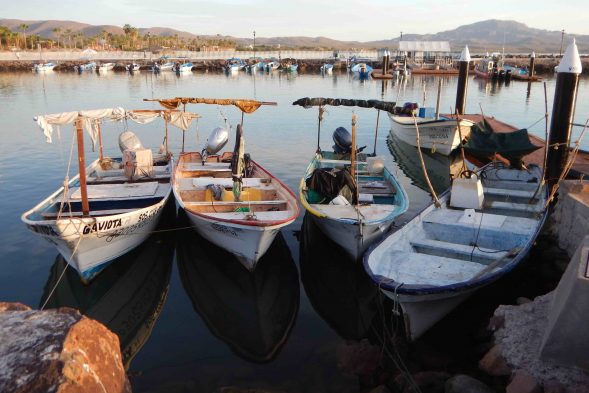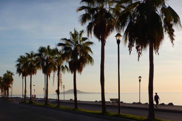 This morning’s walk sought out the west side of buildings or even tall vehicles to avoid the freshly risen sun. July is warm in Loreto. There is no wind, but a light air falls gently down from the mountains, pausing against the west walls.