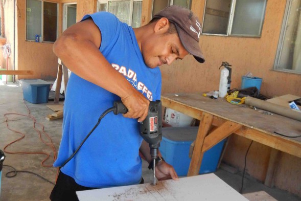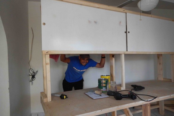 Enter a stack of 2x4s and some plywood, a little bit of ingenuity, and a dab of elbow grease. I cobbled together floor to ceiling storage shelves in the little “bodega”. Ramon and I created the king of all desks complete with sliding white-boards for calendars and notes. Filing cabinets coming soon. Ramon, Marcos, and I made a wall of gear cubbies and organized three fleet’s worth of kitchen stuff.