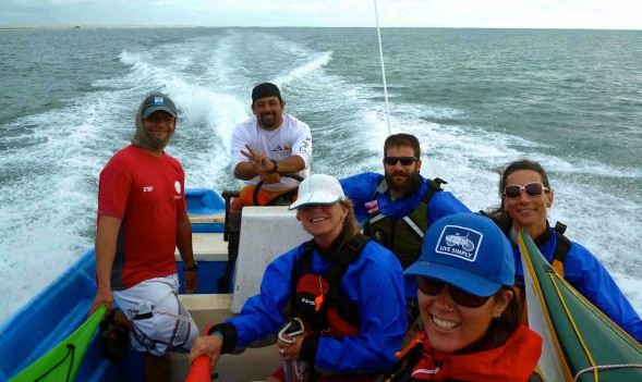 People will do dramatic things to get to good surf. All we had to do was load the kayaks on Marcos’ panga, launch it in front of our hotel–Mar y Arena in San Carlos, motor across the bay, drive it up onto Delia’s waiting trailer, get hauled across a sandy strip of Isla Magdelena (by a valiant Ford pickup), and arrive at a deserted surf beach with a panga-full of surf toys on a trailer! And then play until we were utterly exhausted and ride panga-trailer-Ford back again to the steps of our hotel.