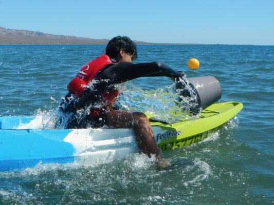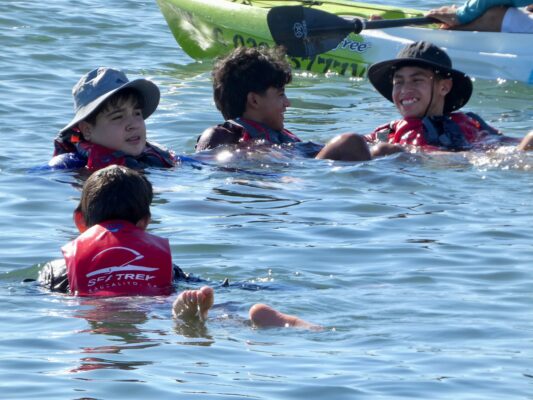 Participants also learn water safety. Many overcome fear of the water to go snorkeling for the first time. Falling out of a kayak happens naturally in the team game of sardines, and other paddling skills are built through games.