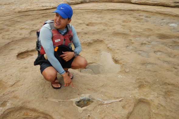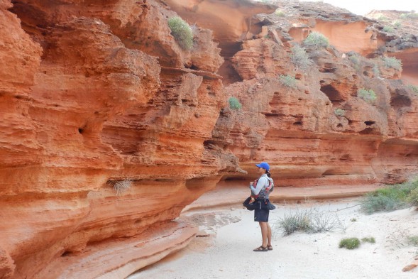 We left the kayaks for a short walk, still wearing our paddling kit. From the slickrock point with the fossil turtle and whale bones, there was a remarkable vista inland, a lowland of red and pink rock with patches of greenery, backed by an imposing white cliff. I recalled there being an interesting walk this way through an arroyo of wind- and water-sculpted pink sandstone. Off we wandered, in our booties, sandals, spray decks, and PFDs. Through a green tunnel with a white sand floor, past cliffs of pink gargoyles.